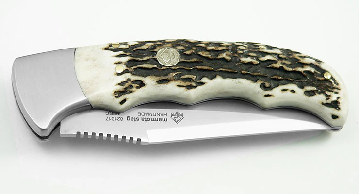 Nož ima zložljivo rezilo z žagico na hrbtni strani in ročaj iz roževine.