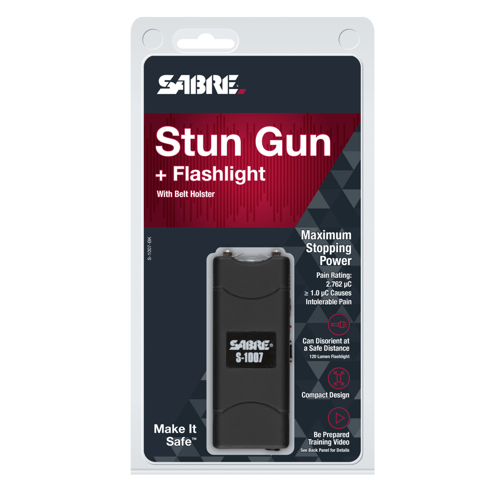 SABRE 2-IN-1 STUN GUN WITH FLASHLIGHT & BELT HOLSTER, 2.762 MICROCOULOMBS (ΜC) CHARGE, 120 LUMENS – Black