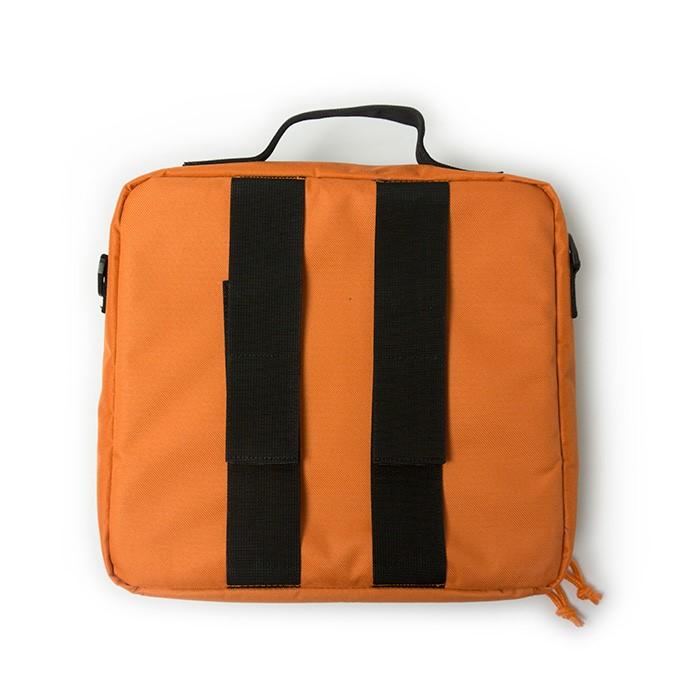 Barva: oranžna s črnimi ročaji in zadrgami.