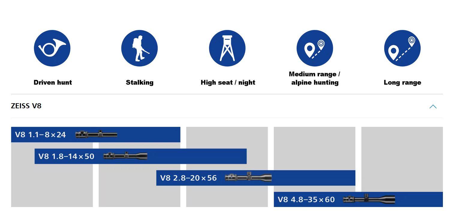 Strelni daljnogled Zeiss V8 zagotavlja uspešne trenutke na lovu, v primerjavi z drugimi daljnogledi Zeiss premore izjemno optično kakovost, velik okular in dobro osvetljeno piko.